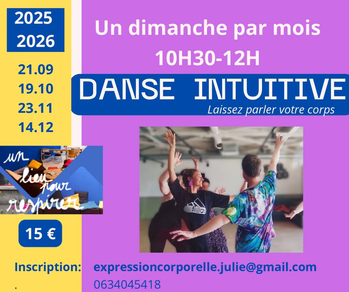 Je suis Julie Camau, danse-thérapeute. Je vous propose lors de cette séance une approche différente du corps et de la danse. Ici il n'y a pas de performance ni de technique, on laisse le corps s'exprimer librement comme ça vient. Pour cela, vous vous laissez guider par ma voix, mes mouvements, la musique et par des exercices seuls.es ou à plusieurs. La danse intuitive est une très belle manière de se détendre, de lâcher prise, de retrouver ses sensations corporelles, de s'ouvrir à soi et aux autres. Elle s'adresse à tous et toutes sans conditions d'âge et il n'y a pas besoin de savoir danser pour y participer. Au plaisir de vous y retrouver.